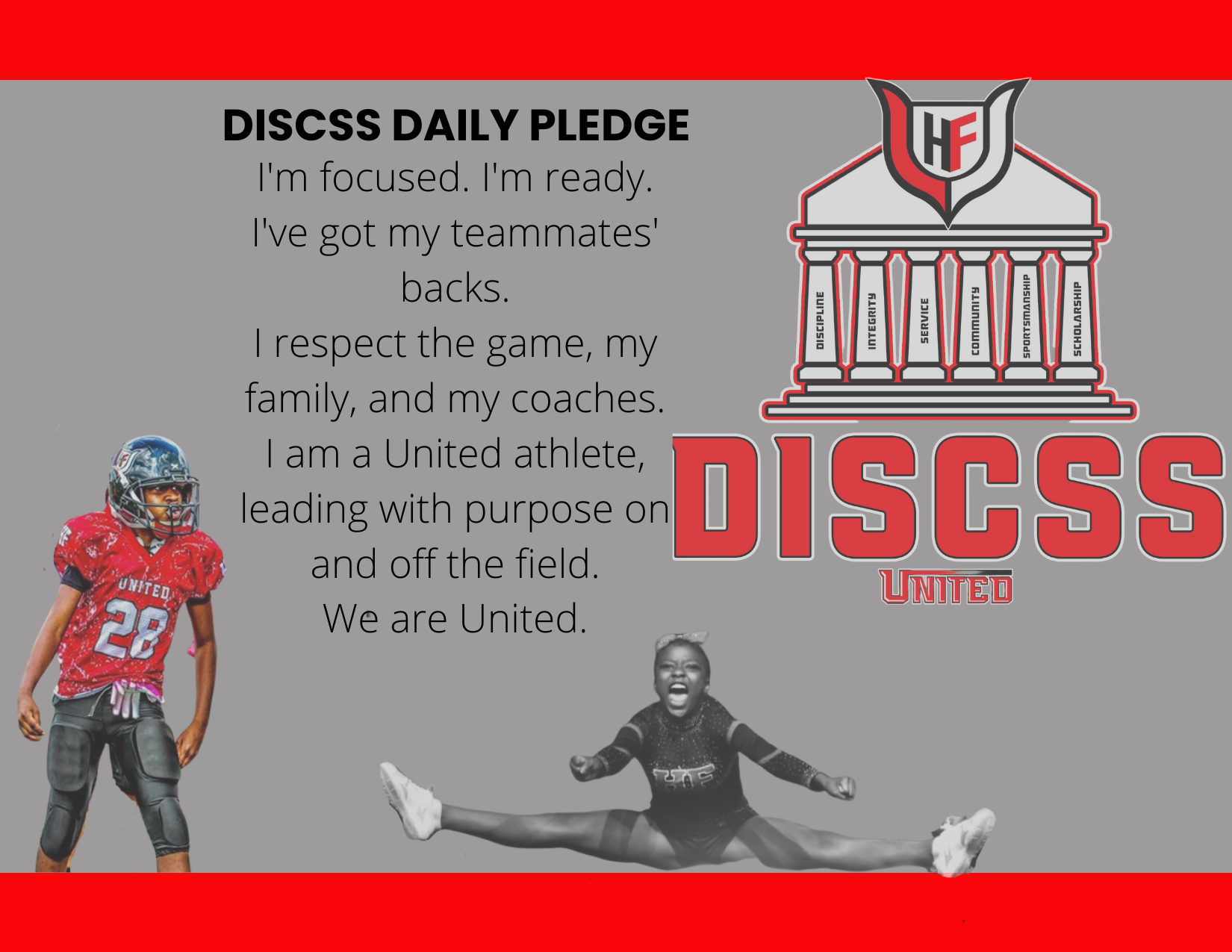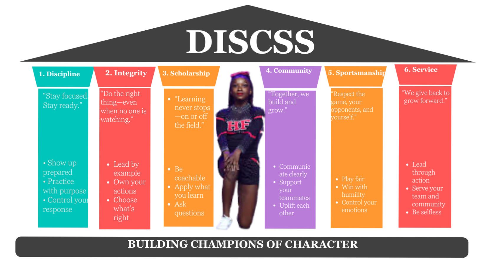 The DISCCS framework is at the core of everything we do, creating not just athletes — but leaders on the football field, cheer mats, and in everyday life. Whether competing, practicing, or performing, every athlete is empowered to lead with: